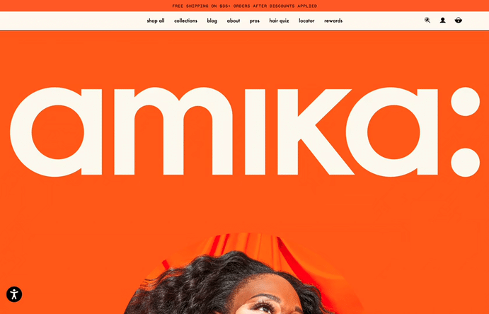 It is a bold moment where the Amika wordmark comes front and center. The cursor interaction triggers the logo to go back to the navigation bar and vice versa.